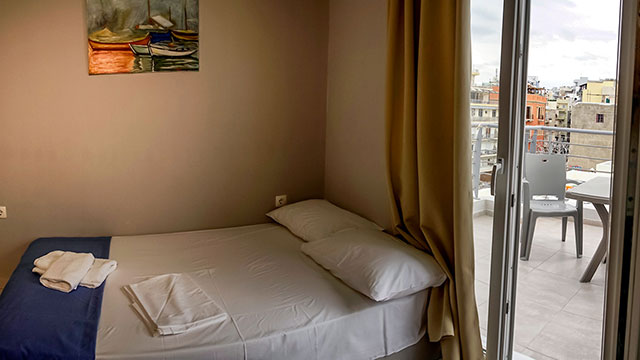 4th floor studio (25m2), where up to 2 people can be hosted. The apartment includes a room with 1 semi-double bed (130 cm) and small, fully equipped kitchen. In addition, a bathroom, air-conditioning, television, free WiFi access and a very spacious balcony with limited ocean view are provided.
